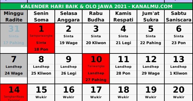 Inilah kalender Jawa 2021 beserta hari, pasaran, dan wuku. Penanggalan Jawa ini bisa kamu gunakan untuk perhitungan hari baik. Kalender Jawa 2021 Lengkap 1. Januari 2021. 17 Jumadilawal 1954-17 Jumadilakhir 1954; Perhitungan tanggal tidak baik: 5, 15, 17, 28, 29; 2. Februari 2021. 18 Jumadilakhir 1954-16 Rejeb 1954 Daftar Hari Pasaran Jawa, Wuku, Bulan Jawa Beserta Arti dan Penjelasannya. Kalender Jawa atau Penanggalan Jawa adalah sistem penanggalan yang digunakan oleh Kesultanan Mataram dan berbagai kerajaan pecahannya serta yang mendapat pengaruhnya. Meski telah sampai pada era modern, namun kalender Jawa sampai sekarang masing terjaga dan digunakan.